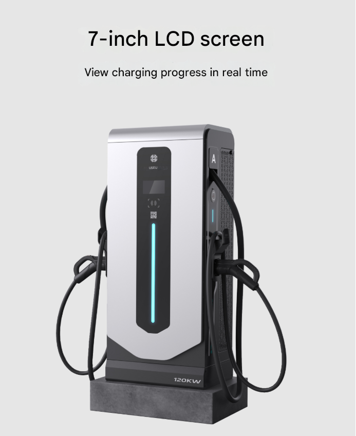 Integrierte 120-kW-DC-Ladesäule mit Doppelkanone für Fahrzeuge mit neuer Energie, 7-Zoll-Bildschirm zeigt den Ladestatus an